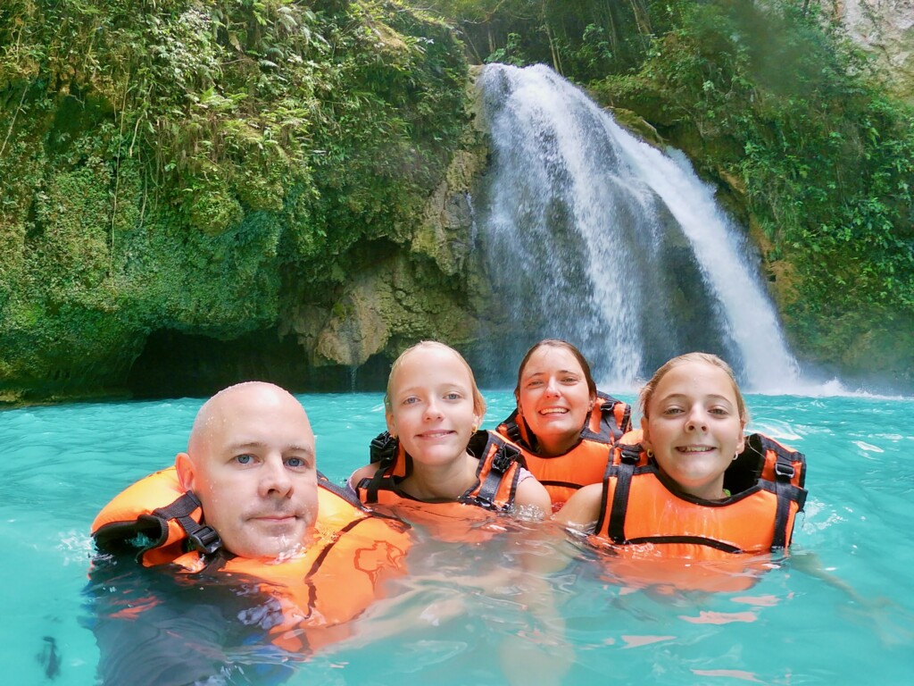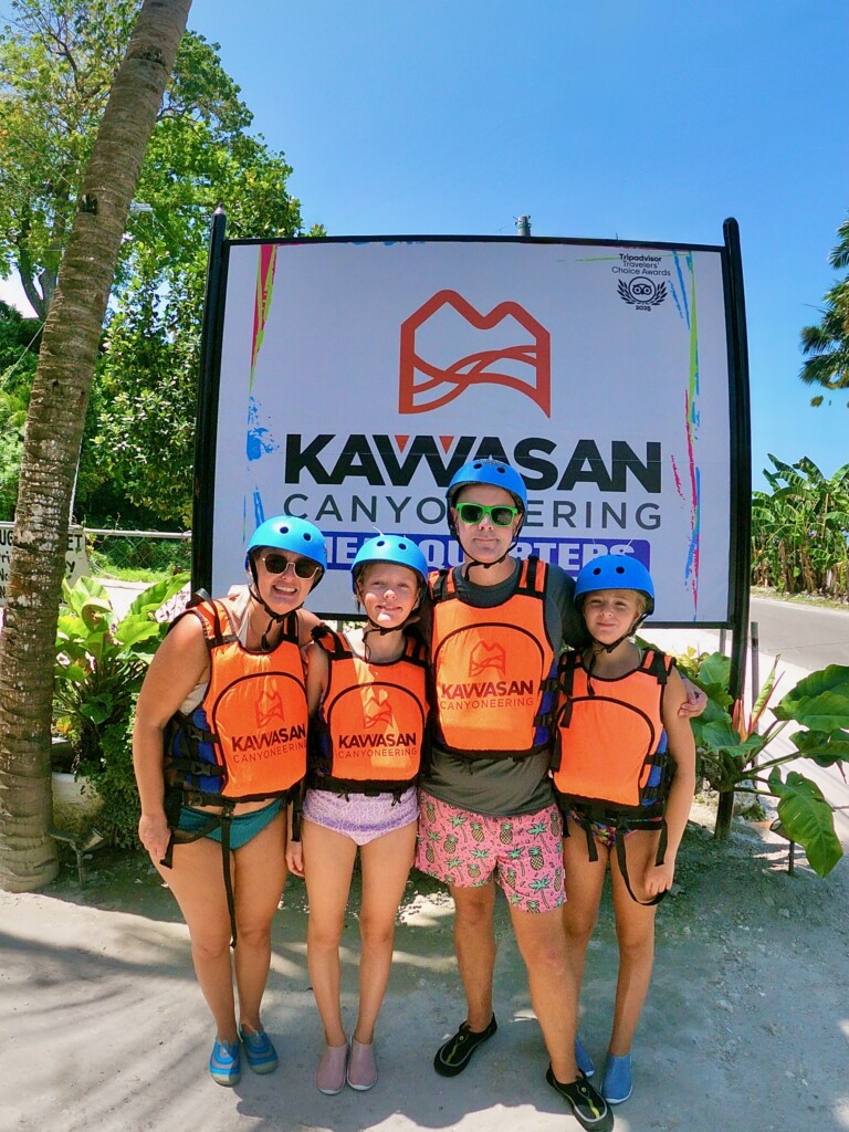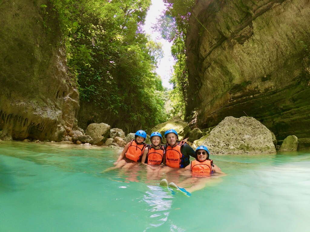 On our drive to Kawasan falls I realized just how tired I was after a 4:45 a.m. wake up and long boat ride from Bohol to Cebu. All I wanted to do was go back to bed, but we still had a long day ahead of us. When we arrived at the tour meeting spot we got a helmet, life jacket, water bottle, and a snack before hopping in a vehicle provided by the tour. First we stopped at a presentation area where a video told us about what we were doing and safety precautions. We were going canyoneering which is a mixture of hiking through canyons, jumping into water, sliding on natural slides and swimming.