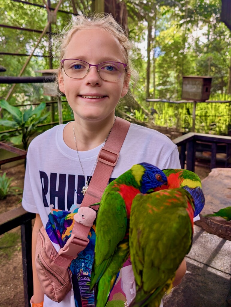 The Bird park is the world’s largest free flight walk in aviary at the length of 21 acres. They have over 3,000 birds and over 200 species. My favorite part was when we got to feed Lories, we got a cup full of food and they landed on our heads, arms and shoulders it was awesome!
