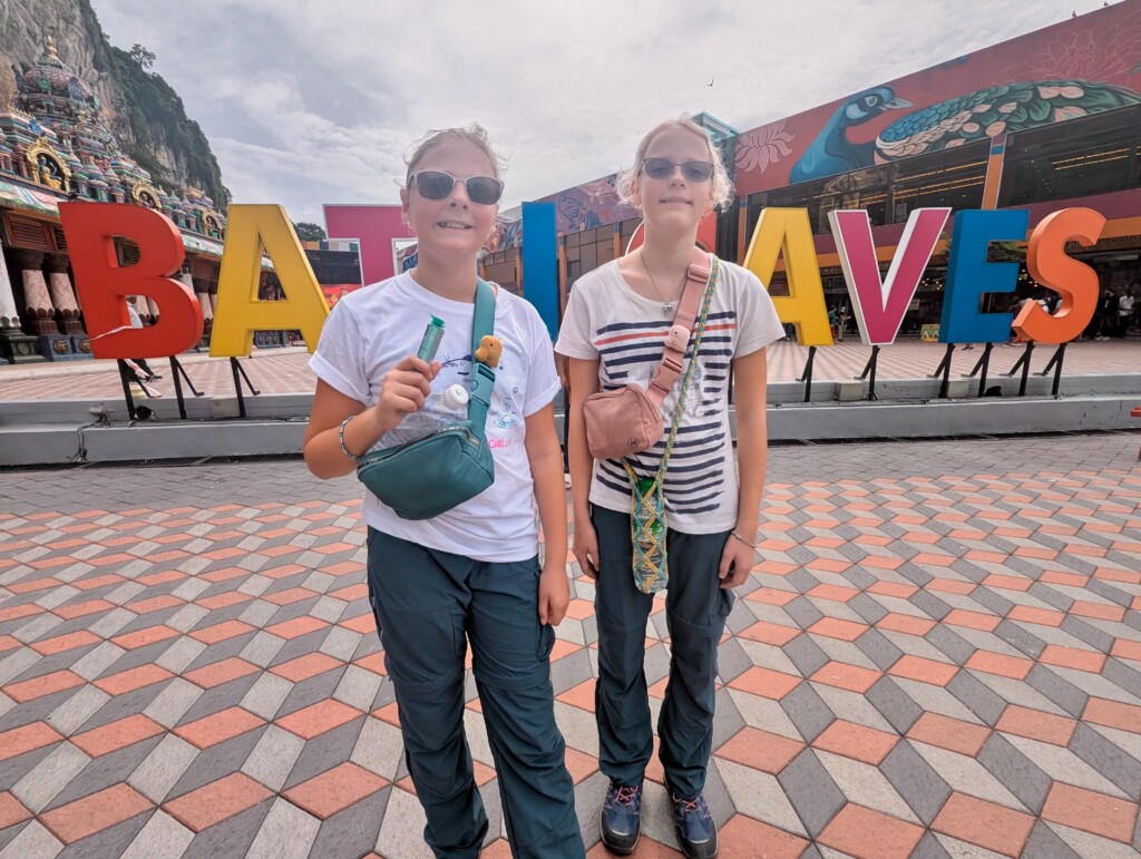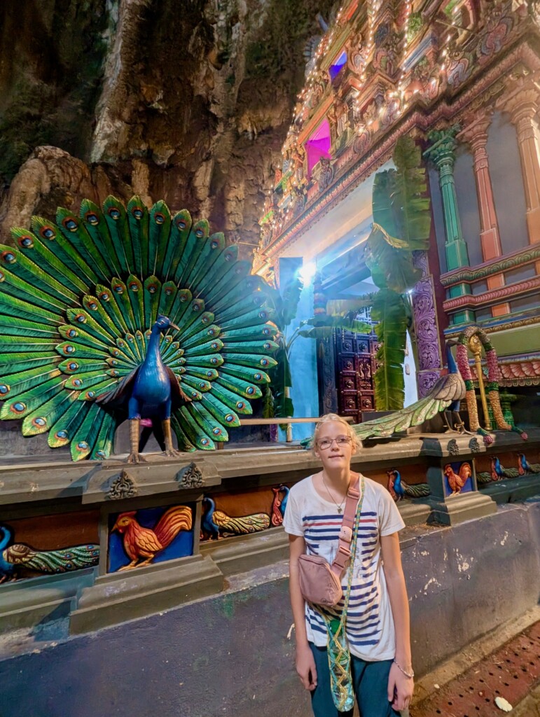 The Batu Cave is a Hindu temple built into limestone caves with a 42.7m gold statue in front of the 272 rainbow steps leading to the caves. We walked up 272 stairs to get to the cave there were monkeys on the railings looking for food and throwing food, we nearly got hit by a coconut! We even saw a monkey eating a popsicle! When we got up we were in a huge cave that led out side again. We were surrounded by cave walls but there was no roof.