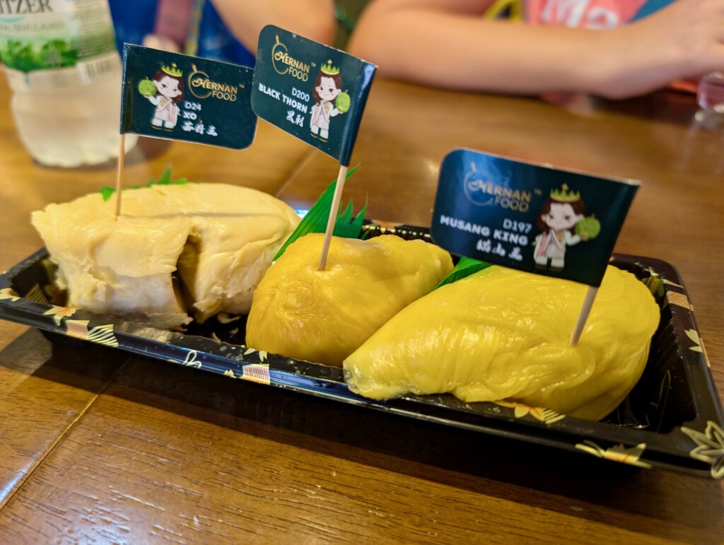 On our way to Singapore we stopped at Melaka to go on a river cruise to explore the city, we saw many water monitors! When we got off the river cruise we decided to walk around and look at some shops, on our way we remembered we have not yet tried durian. Our dad found a place where they sold platers of durian with three different kinds. First we tried XO, that one was the worst. Next we had Black Thorn, it was better and more fruity. Last we had Musang King, it was the best of all of them, it was the most fruity and best texture. But I still prefer other fruits, because durian was not my favorite We also tried a coconut ice cream with durian on top.