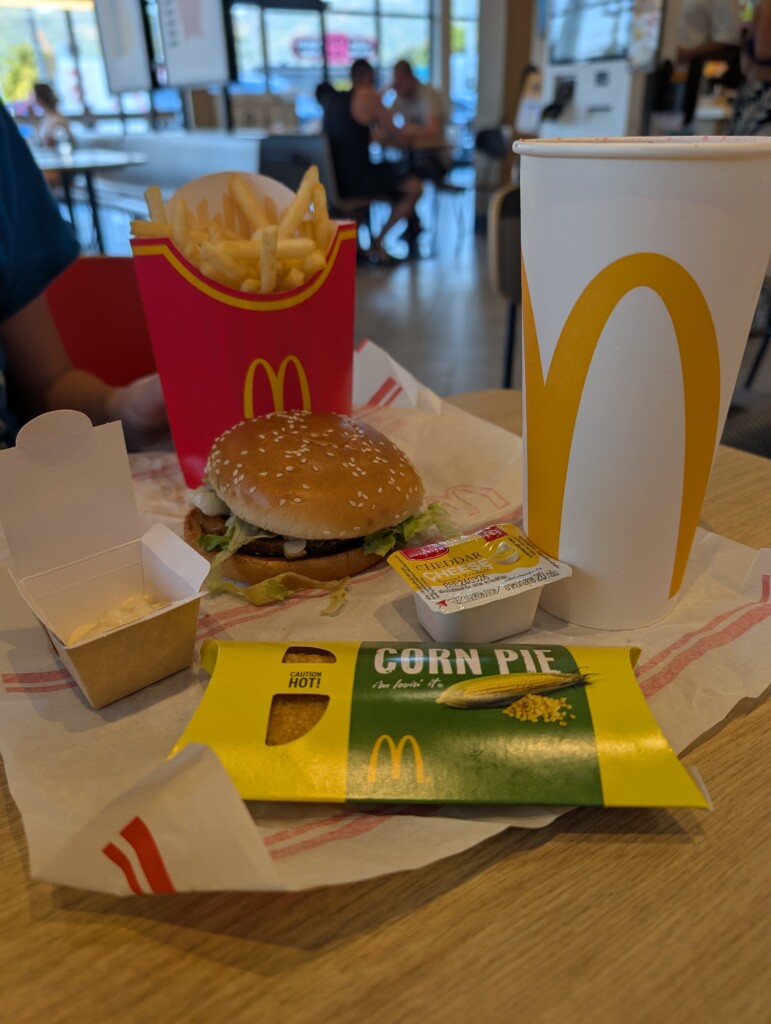 After going to the beach we decided that we have not went to McDonalds yet and we should go! When we arrived there we ordered on screens, I got a samurai pork burger, which is a pork patty with sweet and savory Teriyaki sauce, with lettuce and mayonnaise, I also got french fries and strawberry Fanta. Brooklyn and our Mom got the same thing, and our Dad got a double quarter pounder with creamy parmesan and bacon, and french fries and Pepsi.