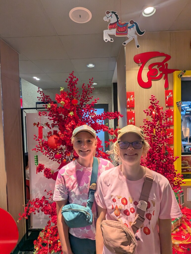 We were on an 11 hour tour to a war site where we got to enjoy a huge lunch of spring rolls, soup, greens, beef and broccoli and lots more. We ate a huge lunch, so when dinner time came we weren’t very hungry, we decided that we should go to McDonald’s. Our mom and Brooklyn were the least hungry so Brooklyn just got a kiwi smoothie with shaker fries and our mom got a pineapple smoothie with shaker fries. I was more hungry so I got a really good iced peach tea with fresh peaches in it, I also got a McRoyal Deluxe, and shaker fries. The shaker fries had a cheesy powder that we got to mix in with the fries. Our dad got a Big Mac, prosperity twister fries, and a soda strawberry McFizz. He also spotted some Happy chicken bites on the menu and wanted to try them so he got one for each of us. The McDonald’s was 4 story’s and had outdoor patio!