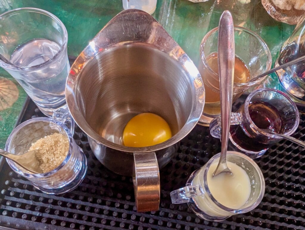 To make the egg coffee we foamed egg yolk, vanilla, honey and sweet and condensed milk, coconut sugar, rice wine and poured it into a glass. Then we added black coffee which sunk underneath the foam. To cook the egg we put the glass into a bowl of hot water for five minutes. Rylee and I just tried the foam without the rice wine which was delicious.