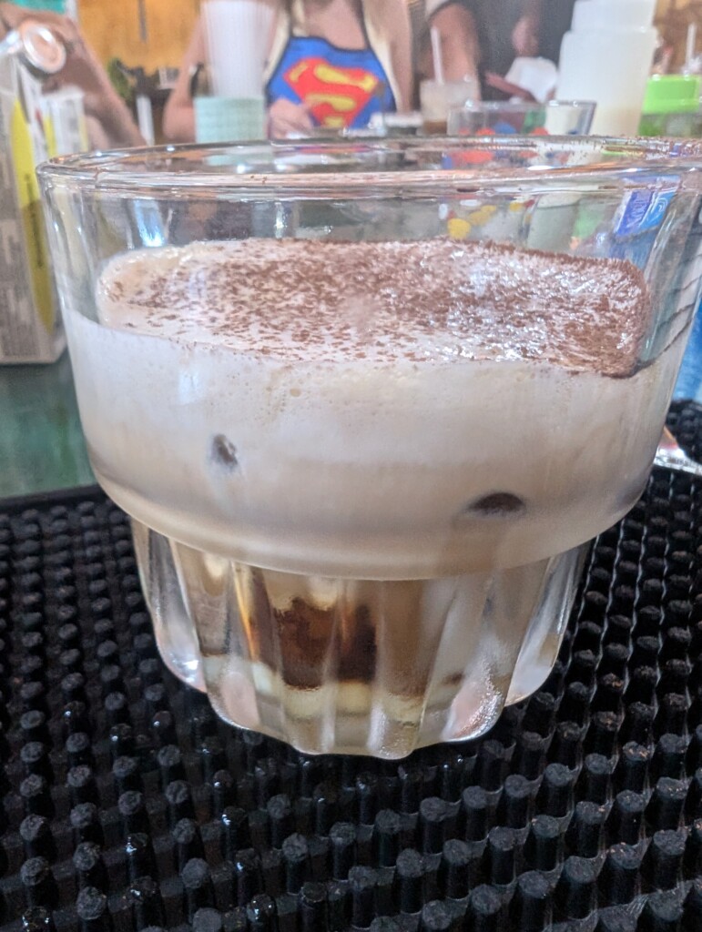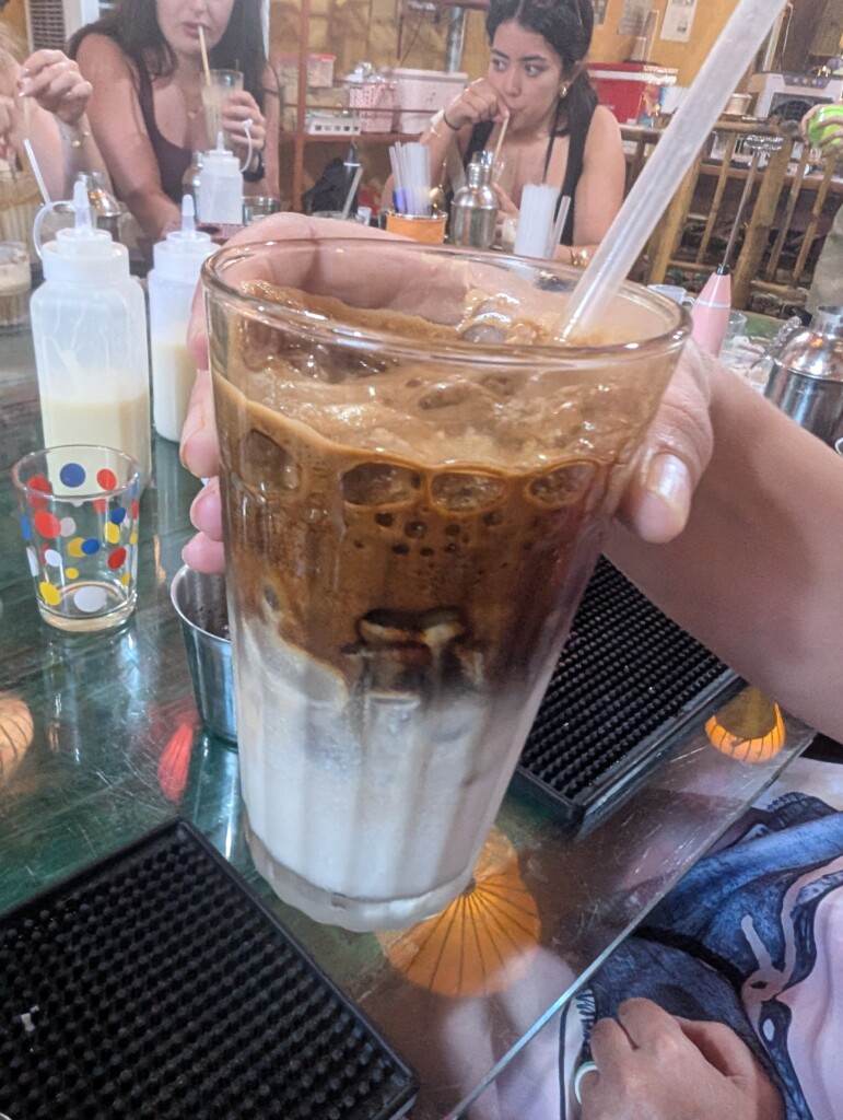 We made the coconut coffee by shaking coconut cream and milk together in a cocktail shaker and pouring it over ice. We also added toasted coconut to the top, Rylee and I just did not add the coffee, so it was iced coconut foam.