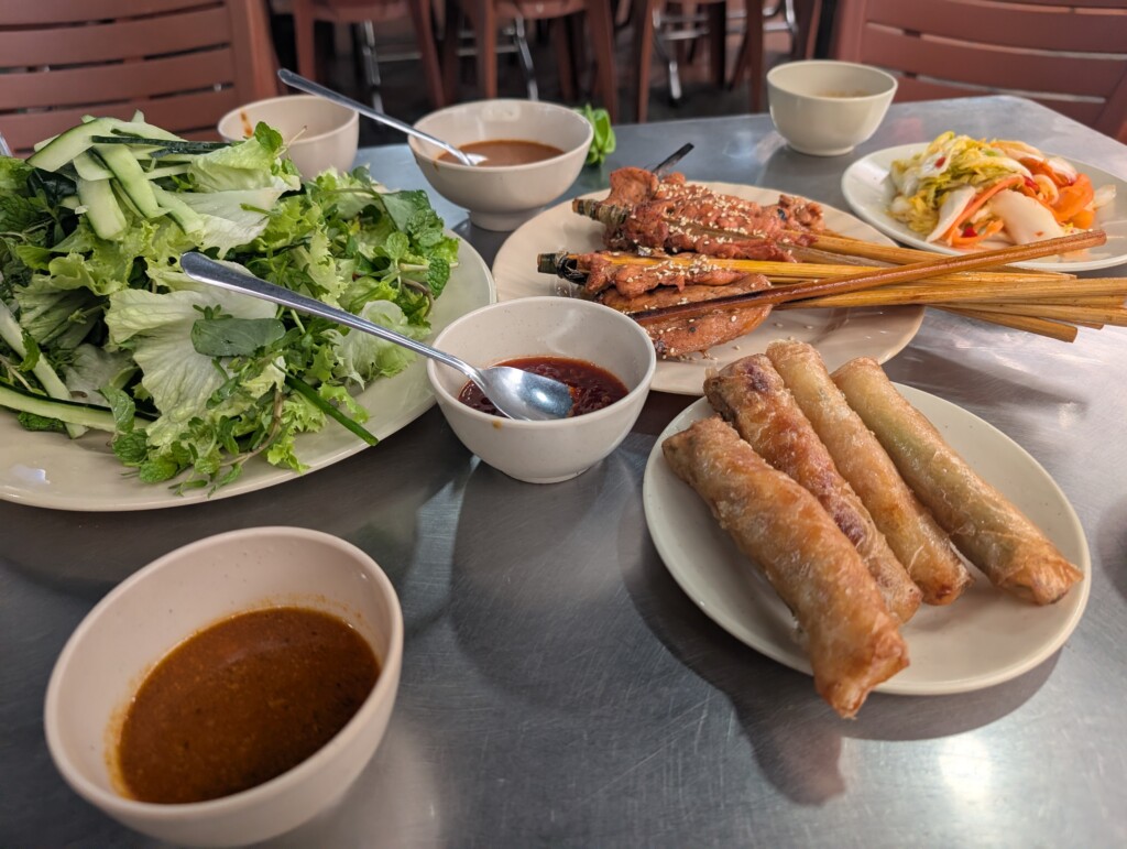 When we were done at the market we headed to a local restaurant and made our own fresh spring roles. We put vegetables and meat onto a sheet of rice paper and rolling it up.