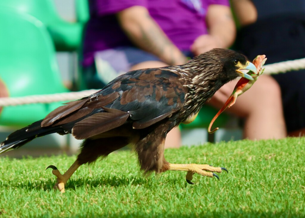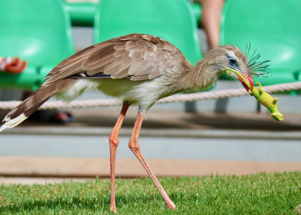 When it was time for the bird show, we hurried over to get seats. Each type of bird did something different to display their talents. One of the birds called a Seriema took a toy lizard and threw it down many times. The presenter said that it was because in the wild they used this method to kill their prey. Another bird that had a cool talent was a crow where the presenter had a volunteer hold out money and the crow snatched it and brought it to the guide. Then the crow returned the person’s money. The hawk was really funny because every time the presenter looked away, the hawk would run out and steal something the presenter was using.