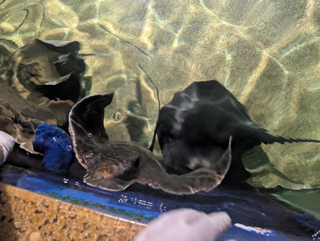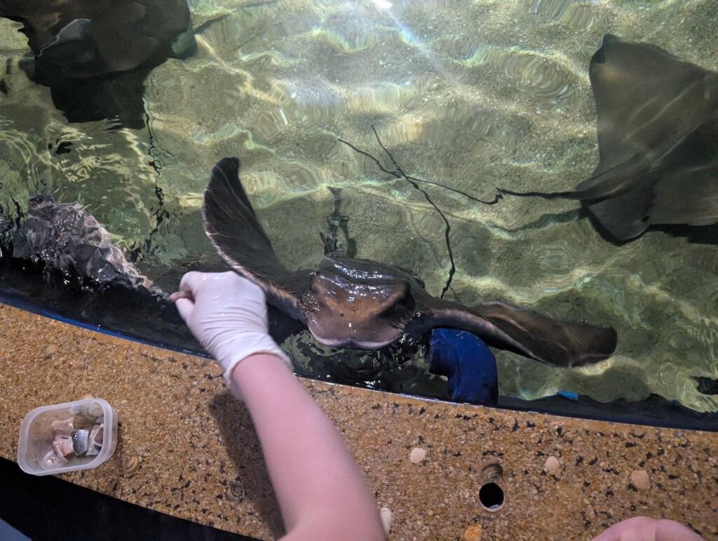 After the bird show, we headed back to the aquarium and fed eagle rays and sting rays. They each were fed in a different way, for the eagle rays, we had to hold the piece of fish against the wall and then they would grab it. For the stingray, we had to flip them over and drop it into their mouths.